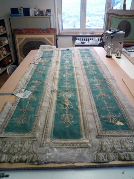 Abnahme der Makulatur, Planieren, Schließung von Rissen, Fehlstellenergänzung, Anbringen eines neuen Trägers, Retusche